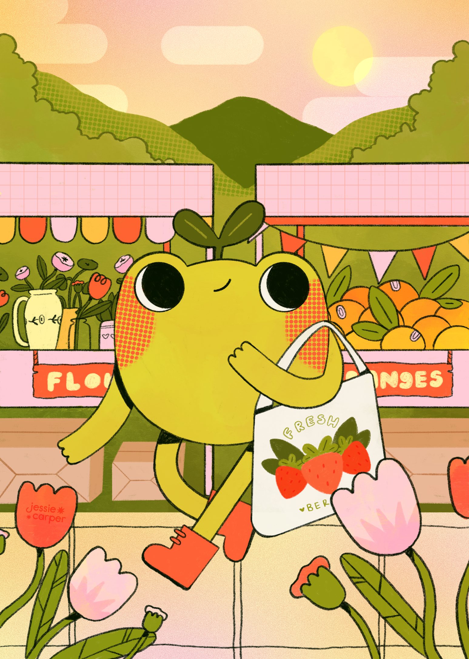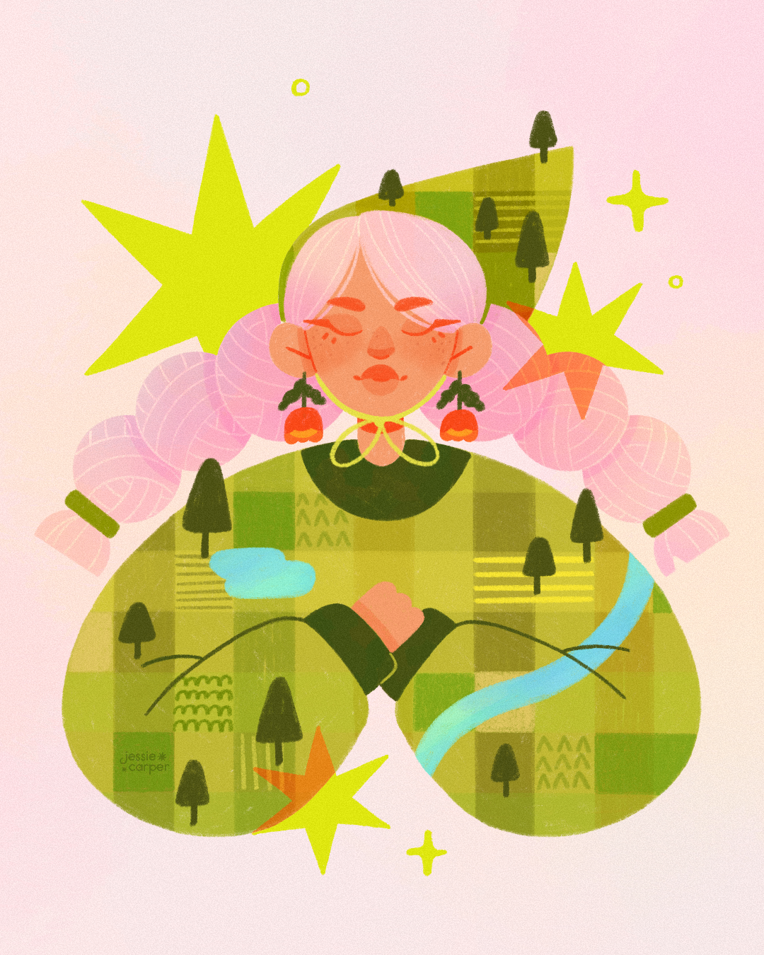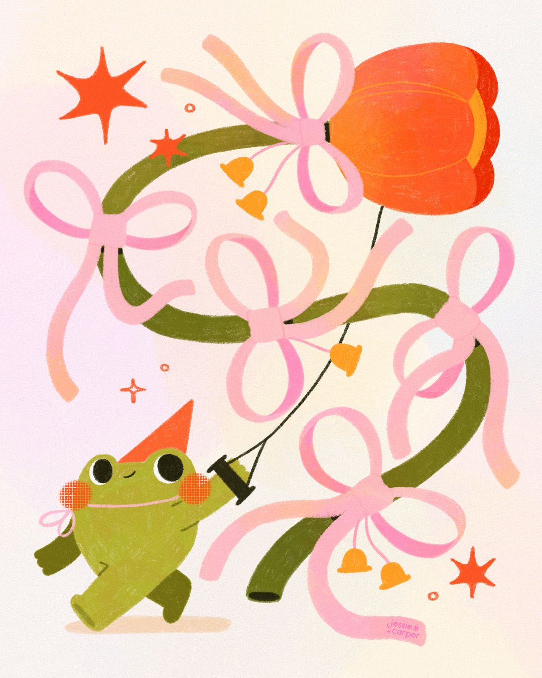 Hi, I’m Jessie — an illustrator and designer based in Cincinnati, Ohio. I create colorful, texture-rich digital illustrations inspired by mixed media. I love drawing silly little guys, often surrounded by lush greenery, florals, and a completely reasonable amount of sparkles. You can usually find me in my little home studio fueled by my favorite latte and a good snack.