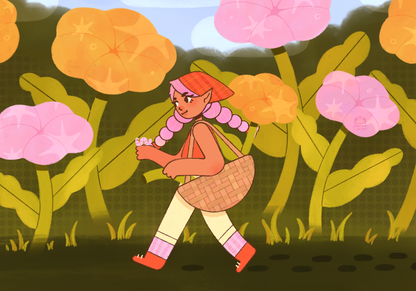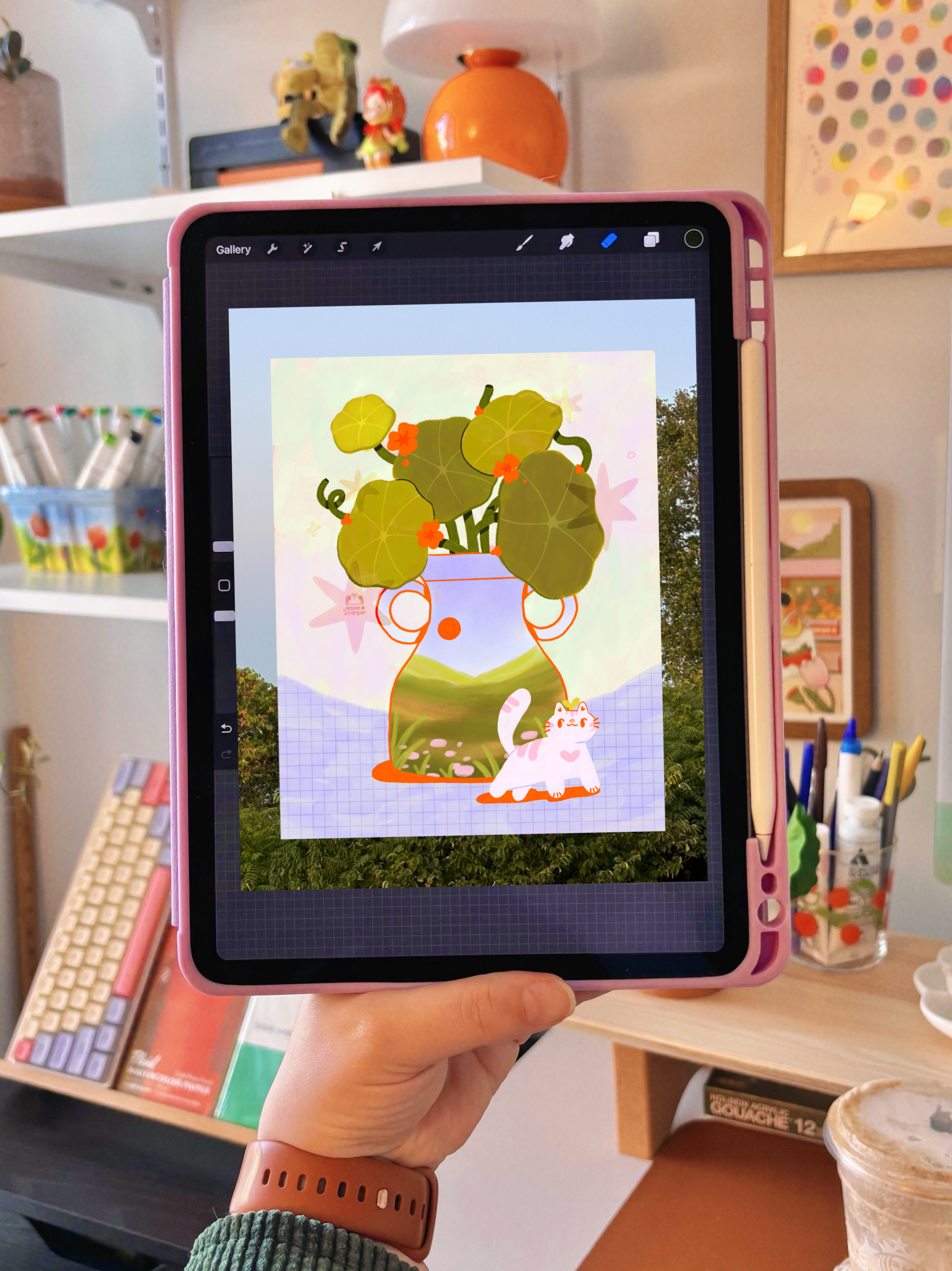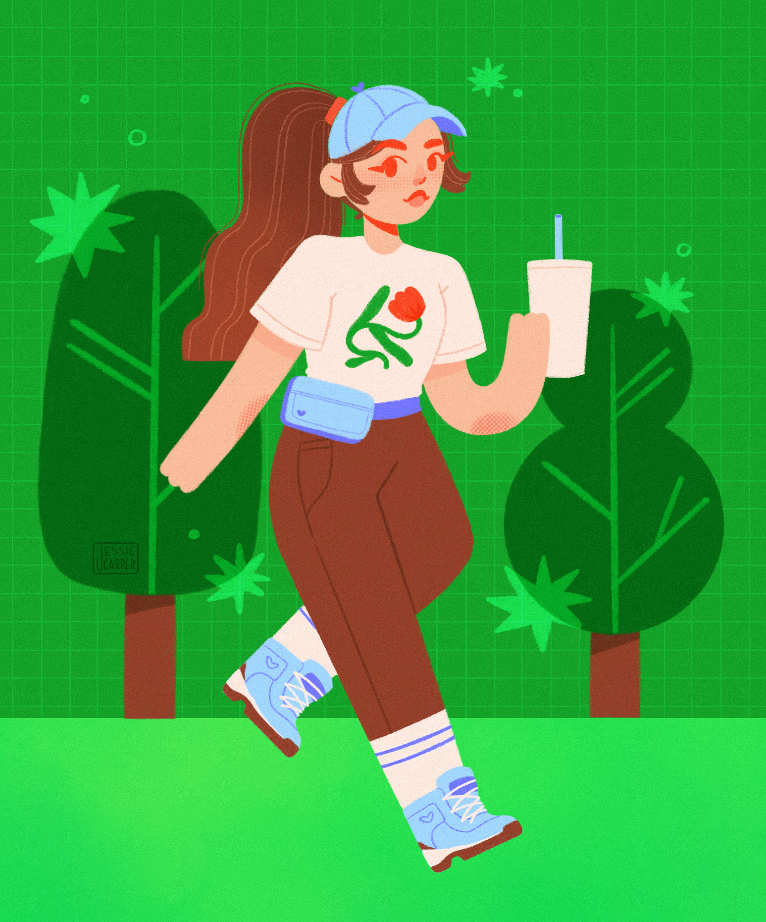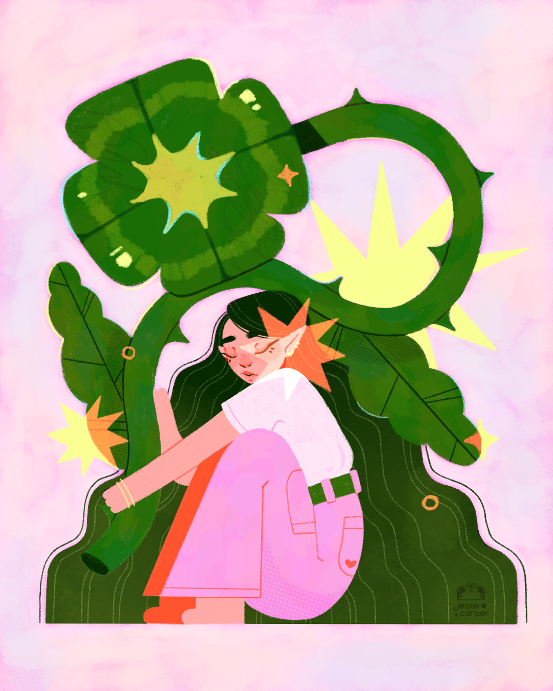 Hi, I’m Jessie — an illustrator and designer based in Cincinnati, Ohio. I create colorful, texture-rich digital illustrations inspired by mixed media. I love drawing silly little guys, often surrounded by lush greenery, florals, and a completely reasonable amount of sparkles. You can usually find me in my little home studio fueled by my favorite latte and a good snack.