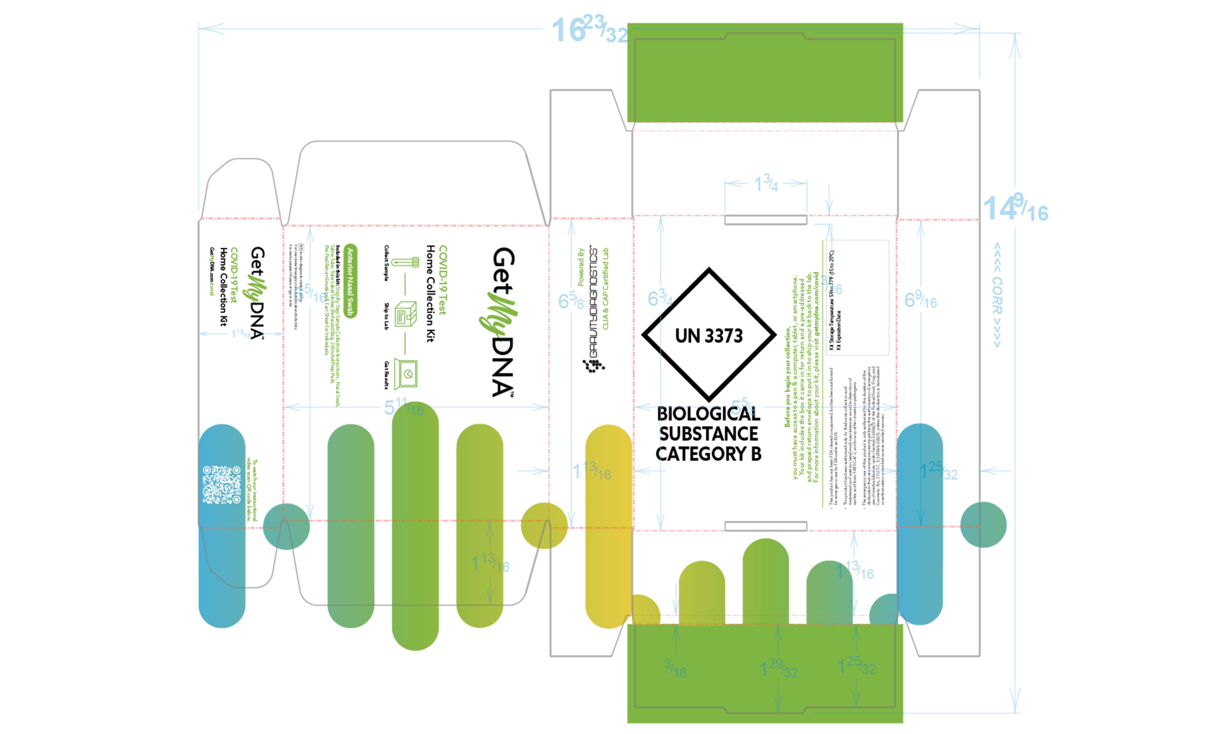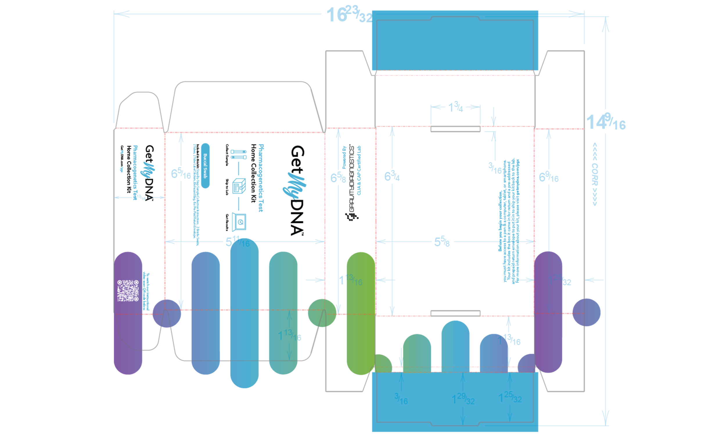 The brand initially expected to have an expanding line of various kit options. I had create the brand guidelines to include every color of the rainbow to eventually encompass extra kits, with each kit being its own color graduation. The company then decided that the name of the brand itself would limit the potential for the brand and we decided to re-brand GetMyDNA entirely, thus only two of the colors were able to be implemented. We chose the yellow to green gradient for everything covid related and the blue to purple gradient for everything Pharmacogenetics (PGx) related. As shown below.