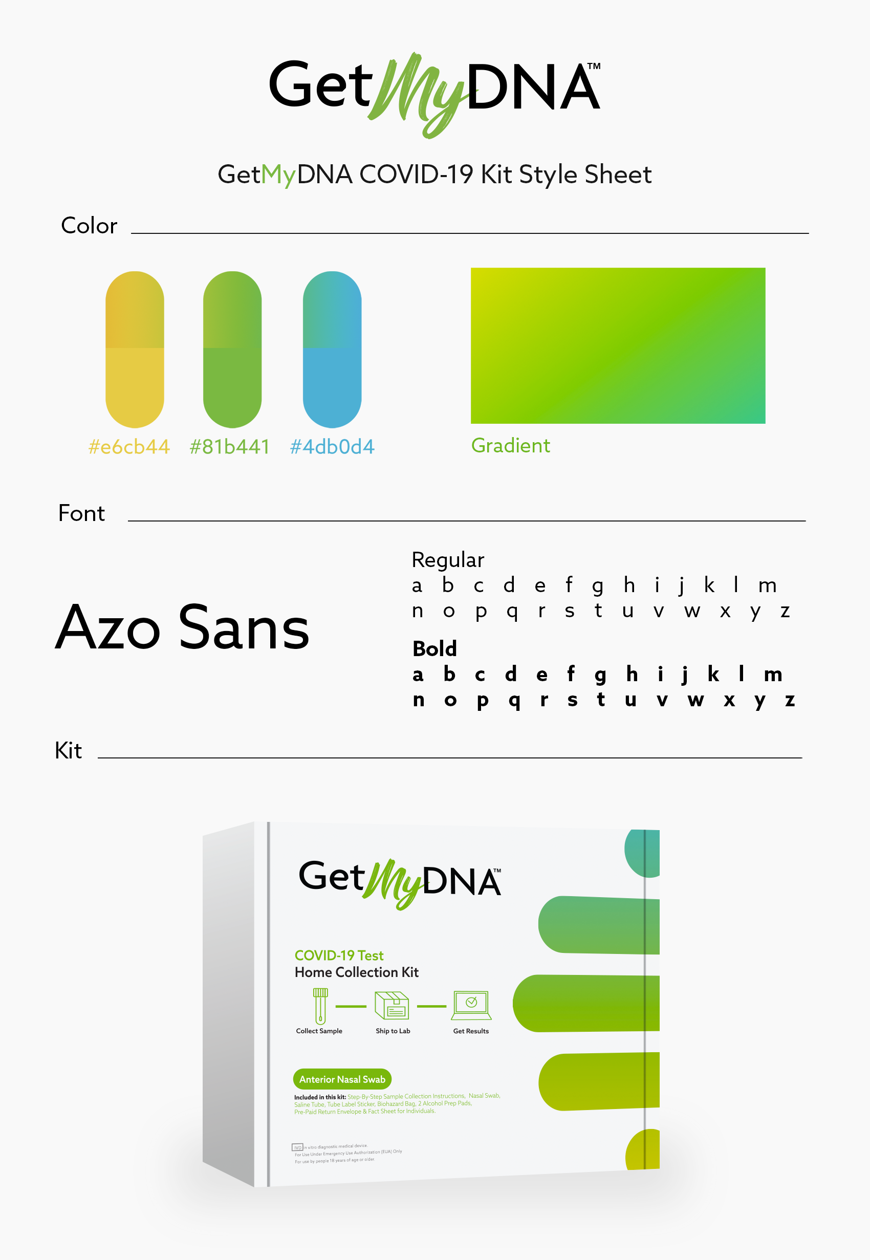 The GetMyDNA COVID-19 home kit was the first to be branded and the first to be re-branded by myself. The kit underwent 4 separate branding iterations with different directions from leadership.